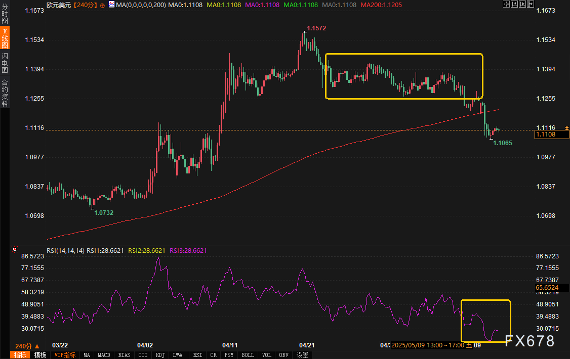 嘉盛——周二(5月13日),欧元兑美元在1.1100关口附近维持弱势整理,日内微涨0.16%,但整体仍徘徊于近一个月低点。尽管中美日内瓦经贸会谈联合声明为市场注入短暂乐观情绪,但欧美贸易谈判僵局叠加欧洲央行鸽派预期持续压制欧元表现。当前汇价技术面呈现明显空头结构,市场焦点转向晚间美国CPI数据对美元流动性的进一步指引。