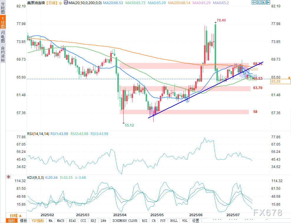 地缘风险   近期数据显示,夏季需求高峰期间全球库存较低,支撑油价,但地缘政治不确定性(如中东局势和俄乌冲突)可能引发进一步波动。   欧盟对俄制裁和特朗普关税政策可能削弱全球燃料需求,推低油价。彭博社报道,原油价格在欧盟通过对俄罗斯能源产业的第18轮制裁后小幅上涨,但分析师对制裁效果持怀疑态度。   市场关注美国对俄罗斯的新制裁(包括降低俄油价格上限至47.6美元/桶)以及特朗普的关税政策,这些可能导致全球燃料需求担忧加剧,限制油价上行空间。   路透社引用Kpler分析师Homayoun Falakshahi表示,制裁对俄油供应的实际影响可能低于预期,油价短期内可能继续在65-70美元/桶区间波动。   关税风险   市场对原油价格的上涨预期依然存在。展望未来,8月1日的关税截止日可能会让市场更趋防御态势,但特朗普此前并非没有推迟截止日或淡化威胁的先例。因此,出现积极结果的可能性更大。   看涨前景面临的风险包括关税引发的新一轮增长恐慌,或市场对利率预期的重新定价更趋鹰派。从更长期来看,原油价格可能在60至90美元区间内震荡,但阻力最小的路径仍偏向上涨。   对美欧可能爆发贸易战的担忧打压了市场人气。投资者担心,这两个主要原油消费国之间日益紧张的关系将抑制经济活动,抑制燃料需求增长。   技术分析