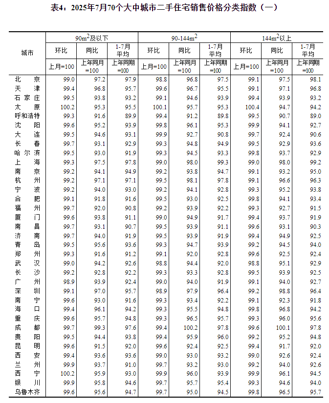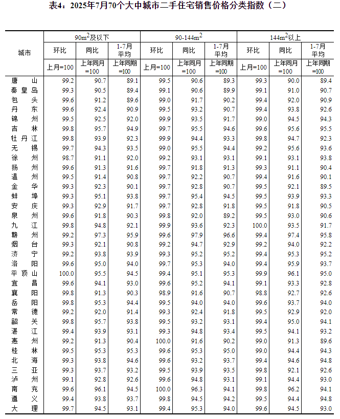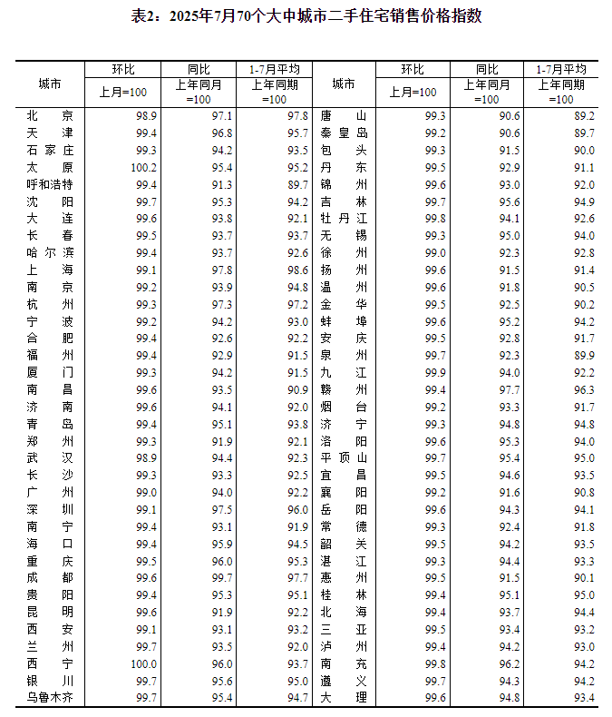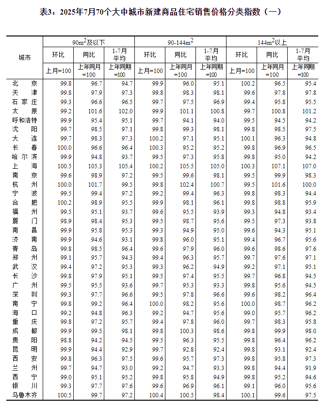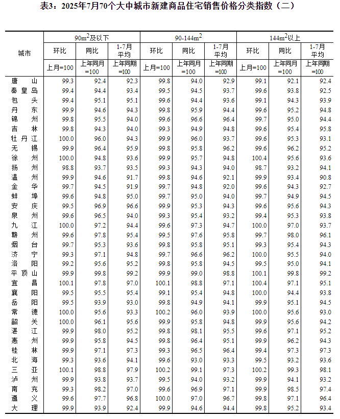 2025年7月份70个大中城市商品住宅销售价格变动情况